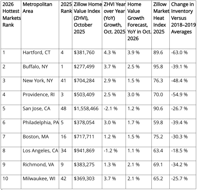 随着2026年的到来,美国房地产市场依然呈现竞争激烈的态势。根据Zillow最新发布的2026年最热门房地产市场预测榜,预计康涅狄格州哈特福德将成为全国购房者最热追逐的城市,而纽约都会区、布法罗、波士顿、费城等东北部大都市区,以及加州的圣何塞和洛杉矶,也跻身前十,房价预计将继续小幅上涨。