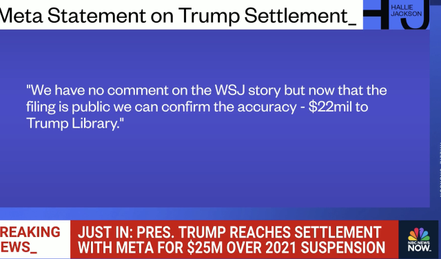 目前,Meta已向旧金山联邦法院提交了和解通知,并由公司发言人安迪·斯通(Andy Stone)确认了相关条款。据悉,和解金中2200万美元将用于资助特朗普的总统图书馆,剩余的300万美元用于支付律师费和其他原告的法律费用。斯通还强调,该和解协议并不要求Meta承认存在任何错误行为。