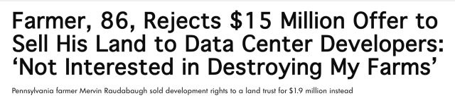 这句话,出自宾州坎伯兰县银泉镇(Silver Spring Township)的默文·劳达鲍格(Mervin Raudabaugh)。在哈里斯堡郊外这片土地上,他已经务农近60年。开发商曾提出以每英亩6万美元的价格收购他名下261英亩农田,总额高达1570万美元,用于建设人工智能数据中心。