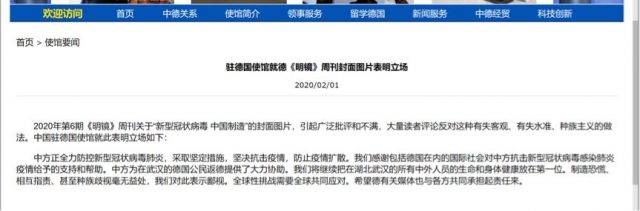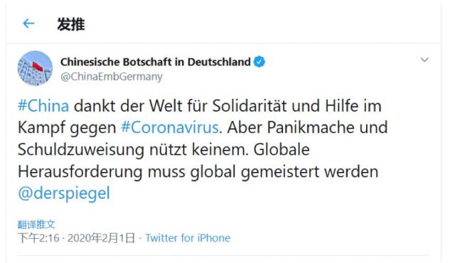 2月1日当天,中国驻德国大使馆在其官网和使馆推特发声表明立场。驻德使馆在官网的声明中指出,中方正全力防控新型冠状病毒肺炎,采取坚定措施,坚决抗击疫情,防止疫情扩散。我们感谢包括德国在内的国际社会对中方抗击新型冠状病毒感染肺炎疫情给予的支持和帮助。中方为在武汉的德国公民返德提供了大力协助。