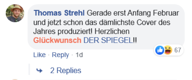 用户“Thomas Strehl”表示:这才刚二月初,今年最蠢的封面就已经出炉了!热烈祝贺《明镜》!