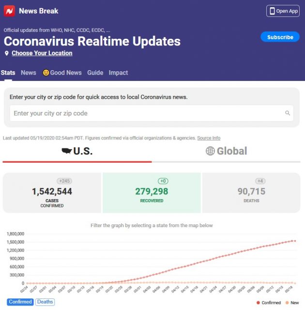 据News Break报道,根据WHO、NHC、CCDC、ECDC等官方数据,截止美国东部时间5月19日凌晨2:54,美国新冠累计确诊1542544例,死亡90715例,康复279298例。