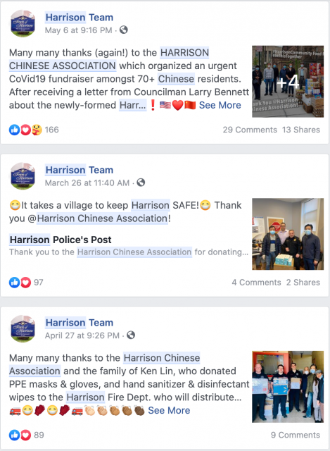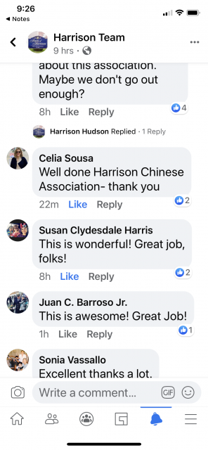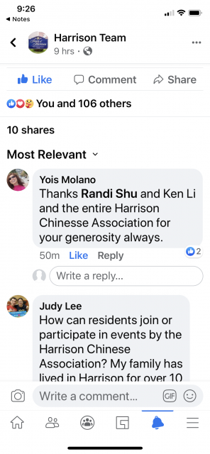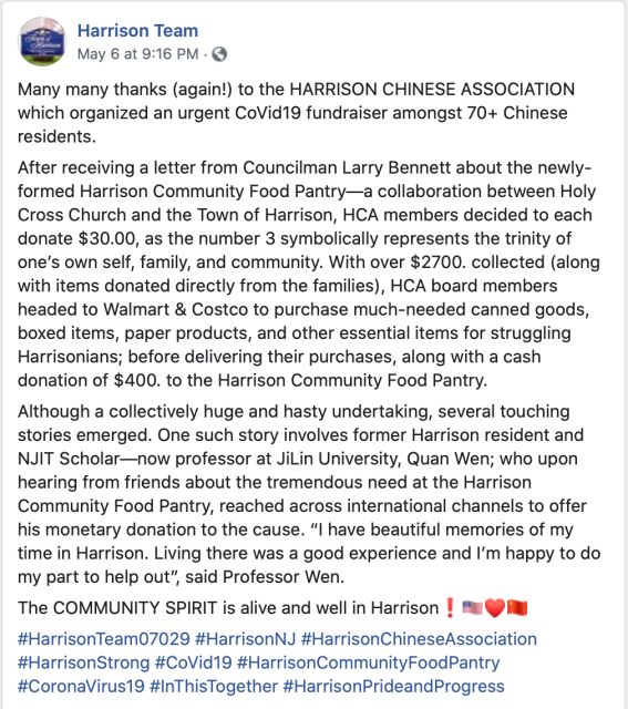 周五(5月7日)凌晨,哈里森华人社区的活动新闻出现在脸书(Facebook )的Harrison Team和NJ Heroes 页面上,两百多个为华人点赞👍和正面留言充满着温暖,传递着爱心。