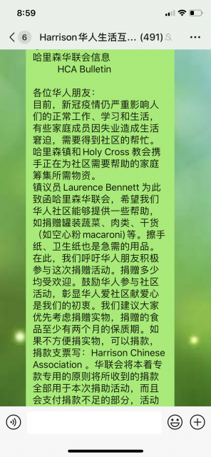 另外一位曾经就读于罗格斯大学现任教于某大学的捐赠者也积极联系活动负责人。她说,“刚才看到群里组织帮助困难居民的活动,感谢您的组织。虽然我不住在Harrison了,但它是我在美国留学的第一站,我对我们的town(镇)还是很有感情的,想参加一下相关募捐活动。小小心意,表达一点支持❤️。”