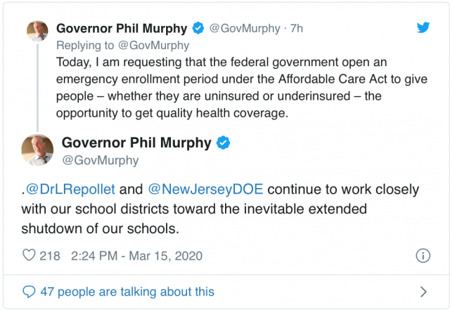 3月14日晚,新泽西州长墨菲(Phil Murphy)在社交媒体上通报,当天出现州内第2例感染新型冠状病毒死亡病例,墨菲透露该死亡病例为1名50岁女性,生前在Monmouth郡的CentraState医疗中心接受治疗。