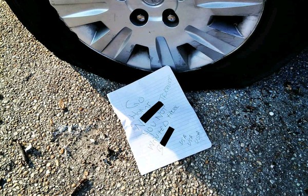 子车遭破坏,轮胎边还遗留一张种族歧视字条。