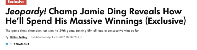在最新一集播出的 Jeopardy! 中,Jamie Ding 再次轻松拿下一场胜利,将连胜纪录刷新至第29场,同时把个人累计奖金推高至 793,602美元。仅这一场比赛,他就再入账 19,001美元。这样的节奏,早已不只是“赢一场比赛”,而更像是在稳定、持续地拉开与其他选手之间的差距。