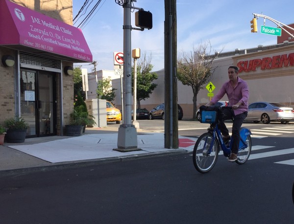 自行车车道有助于鼓励人们上下班使用自行车, Stener说。Hoboken,Weehawken和Bayonne也是Hoboken Bike的一部分。