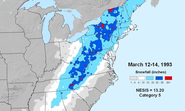 1993年3月12日至3月14日这场暴风雪袭击了新泽西州和其他州,并被列为极端5级暴风雪。被称为“世纪之风”,并被评为影响美国东北地区近代影响最大的暴风雪。新泽西州有一半以上的地区被10到20英寸的积雪覆盖,北部地区更是出现20至30英寸的积雪。