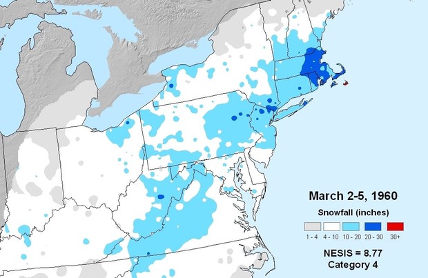 1960年的大暴风雪,这场恶劣的风暴于1960年3月2日至3月5日发生,被列为第4类暴风雪。