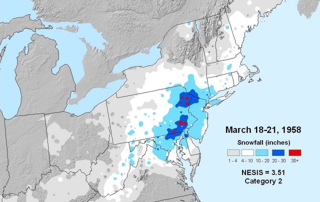 1958年3月下旬的暴风雪,这次风暴从1958年3月18日一直延续到3月21日,被认为是一场重大的二级暴风雪。