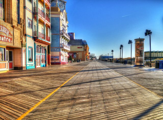 大西洋城的木板大道,全长10英里,建成于十九世纪末,它的奇特在于它的路面用木板铺成,虽经大西洋风浪的考验已久,却风韵犹存。