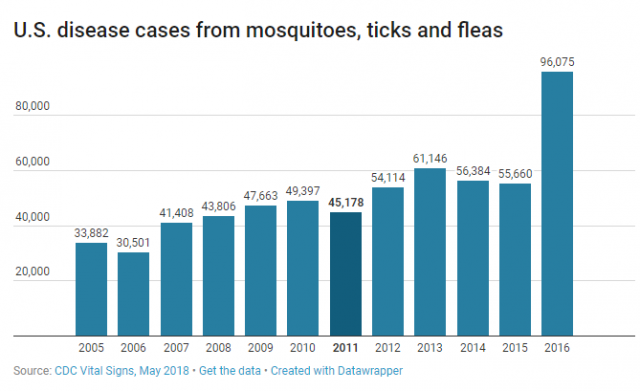 2004年,美国仅有27,400例媒介传播疾病报告病例。 但是,到2016年,这个数字猛增到96,000多。 在此期间,全国共有近65万例这些疾病。然而,卫生官员认为这个数字可能会更大,因为感染症状通常因轻微而不会被报告和不被认出。