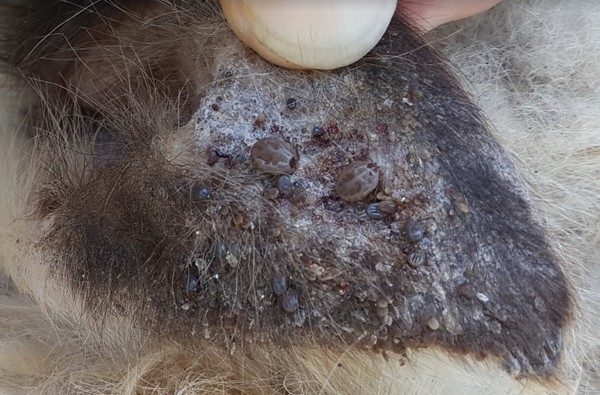图为在牧场的一只12岁的冰岛绵羊Hannah身上出现的蜱虫