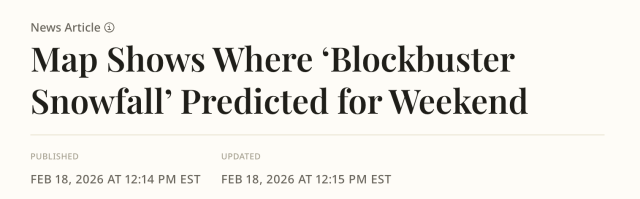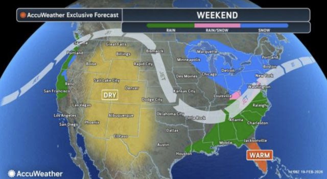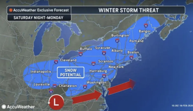根据 AccuWeather 发布的预报,周日(2月22日)至周一(2月23日)之间,一场潜伏在东太平洋的不稳定系统可能在本周末重组,并在大西洋沿岸附近增强。高级气象学家 Alex Sosnowski 指出,纽约市、波士顿和费城等大城市都有可能出现明显降雪,但“情况复杂,目前尚无法确定95号州际公路沿线城市是否一定会下雪”。