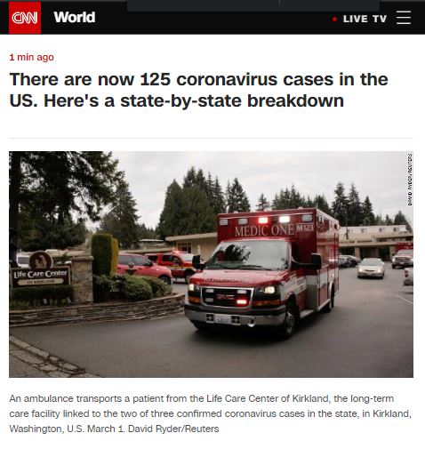 截至3月3日美国东部时间晚上10:40,据CNN报导,全美共有125名患者感染新冠病毒,其中9人死亡,全部来自华盛顿州。除了45例来自钻石公主号邮轮,3例来自武汉撤侨包机外,剩下77例病例分别来自美国13个州。这些数字包括CDC已确诊病例和“待确诊”病例。