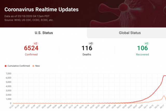 据News Break和Johns Hopkins公布的数据显示,截至3月18日美国东部时间凌晨03:42,美国至少有6524例确诊病例。
