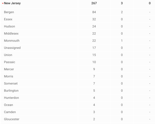 - 新泽西州(New Jersey):267,死亡 3