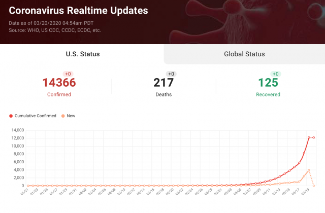 据《Worldometers》和Break News公布的数据显示,截至3月20日美国东部时间凌晨4:43,美国至少有14,366例确诊病例。