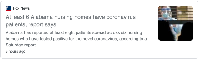 据周六的一份报告显示,阿拉巴马州至少有8名患者散布在6家养老院,他们的新型冠状病毒检测呈阳性。截至周日,阿拉巴马州已发现至少827例新冠病毒病例,其中4人死亡。