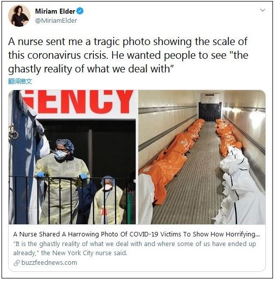 - 纽约曼哈顿一所医院的一位38岁护士发出的一张照片被记者发到推特上。护士就是想让大家知道前线医疗工作者们所经历的现实。