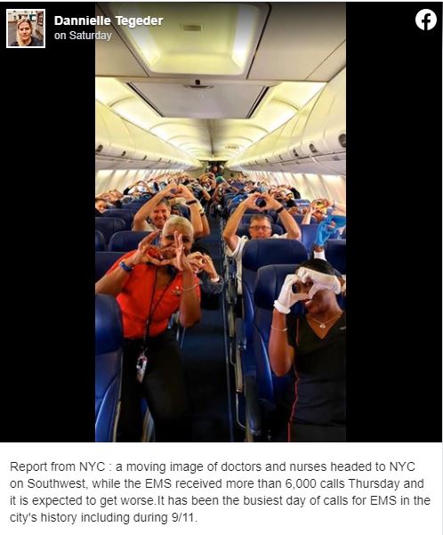 - 满满的正能量:西南航空载着一群志愿来到纽约市的医护人员。