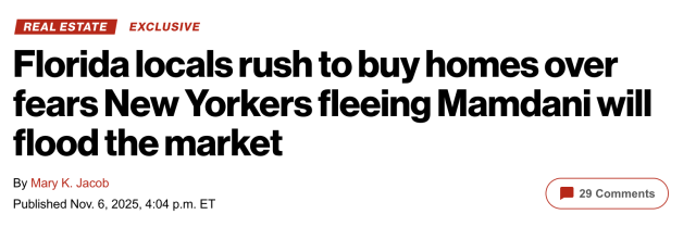 在政治言论激烈交锋的同时,南方的房地产市场已经出现了实质性反应。随着曼达尼当选的消息传出,佛罗里达当地居民开始抢购房产,不是出于对纽约政治的恐惧,而是担心可能涌入的纽约人会抢占市场。