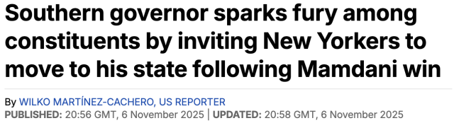 当佐兰·曼达尼周二晚赢得纽约市市长选举的消息传出,政治冲击波迅速穿越州界,在1300英里外的南方激起意想不到的涟漪。这位自称民主社会主义者、纽约市首位穆斯林市长的最年轻当选者,不仅重新定义了美国最大城市的政治格局,更引发了一场横跨多州的迁徙心理战。