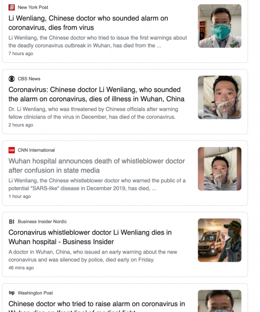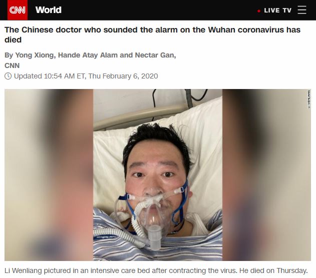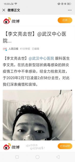 2月6日,有中国媒体报道称,眼科医生李文亮,已于2月6日晚21点30分许,因新型冠状肺炎抢救无效逝世。