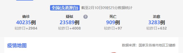 (北京时间)截至2月10日09时25分,全国确诊40235例,疑似23589例,死亡909例,治愈3283例。湖北、浙江、广东、湖南、河南、江西、安徽、重庆、山东、四川、江苏、上海、北京、福建、广西、河北、云南、陕西、黑龙江、海南、辽宁、山西、天津、甘肃、宁夏、内蒙古、新疆、贵州、吉林、香港、台湾、青海、台湾、澳门和西藏都已有确诊病例。日本96例、泰国32例、新加坡43例、韩国27例、德国14例、澳大利亚15例、马来西亚18例、越南14例、美国12例、法国11例、阿联酋7例、加拿大7例、印度3例、菲律宾3例、英国4例、意大利3例、西班牙2例、俄罗斯2例、比利时、柬埔寨、斯里兰卡、芬兰、瑞典、尼泊尔各1例。