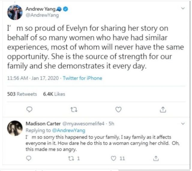 据世界日报报道,民主党总统候选人杨安泽的妻子卢艾玲(Evelyn Yang)对外陈述自己在怀孕产检时,遭哥伦比亚大学妇产科医生哈登(Robert Hadden)性侵,目前正和其他数十名受害者,共同控告哥大及其附属医院和已被吊销行医执照的哈登。卢艾玲的故事16日晚公开后,社群网站推特呈现爆炸性团结支持氛围,#WeLoveYouEvelynYang(卢艾玲我们爱你)标签广为流传。
