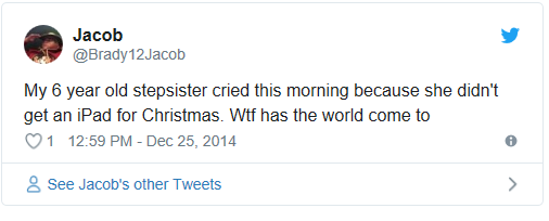 他们在推特上公开侮辱他们的父母并发脾气,因为他们没有得到iPad或正确的彩色小工具。甚至还有些人已经在eBay上出售他们不需要的礼物。