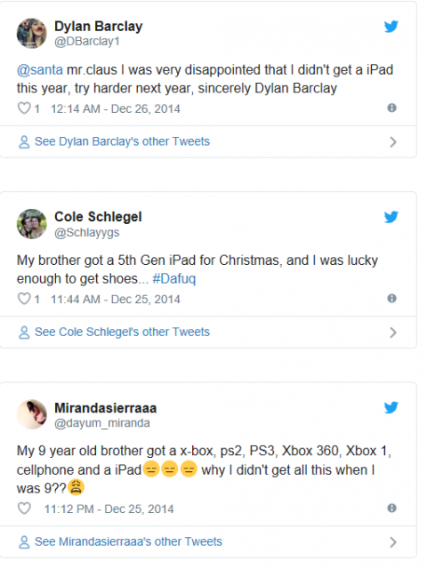 虽然这些推文中的一些人可能是个别现象,但在Twitter上搜索诸如“没有得到ipad”之类的话将会产生数百个抱怨他们的圣诞礼物的真实结果。
