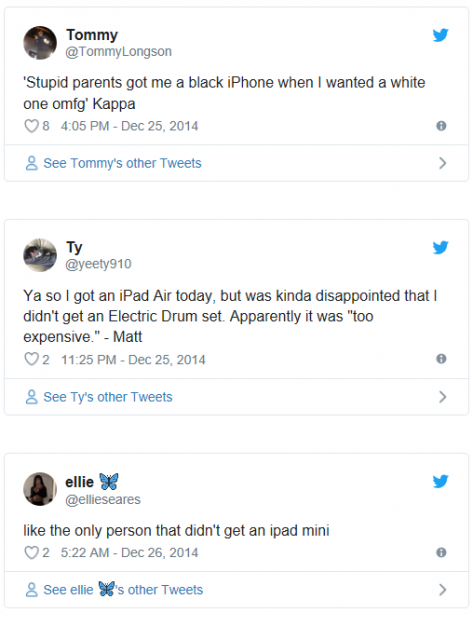 他们在推特上公开侮辱他们的父母并发脾气,因为他们没有得到iPad或正确的彩色小工具。甚至还有些人已经在eBay上出售他们不需要的礼物。