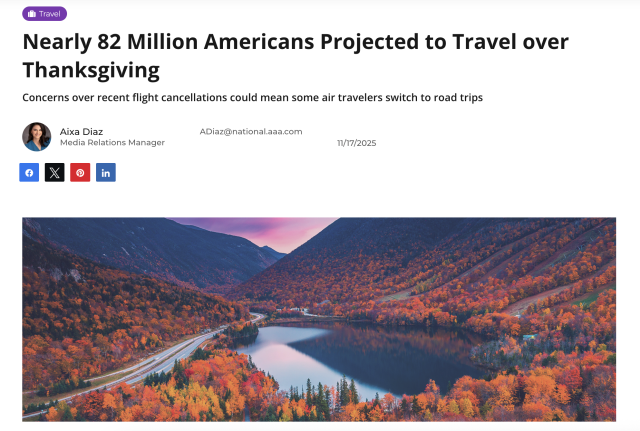"感恩节的出行人数总是令人印象深刻,因为这个节日已经成为人们外出与亲人团聚的代名词,"美国汽车协会旅游副总裁斯泰西·巴伯表示。"人们愿意克服拥挤的人潮,并在最后一刻调整行程,只为创造终生难忘的回忆,无论是探望远亲还是与朋友聚会。"