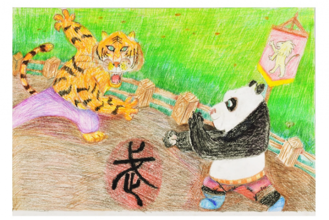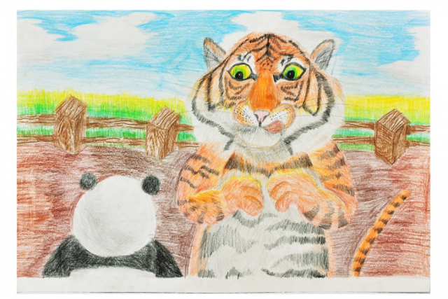 Three days later, all the animals came to the grassland stage located at the edge of the forest, the majestic tiger and the lovely panda standing on opposite sides of the stage. "How dare you disobey my order?" the tiger demanded. The panda replied calmly, "I can harvest bamboo, and provide this to you in tribute, would you accept? If you want meat, then I have no meat except myself or my children. However, I'm not willing to do it, therefore I have come here to fight you."