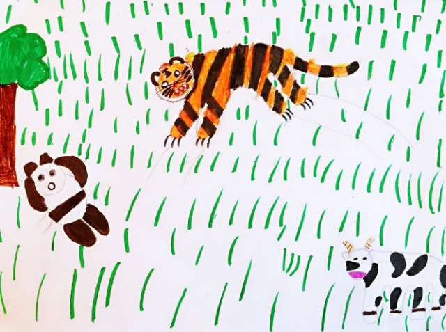 The animals elected the old cow as the official to oversee the contest. When the old cow announced the start of the contest, the tiger sprang at the panda. The tiger had not hunted for a long time on his own and was a bit slow. The panda easily escaped the tiger’s attack. Then the tiger attempted to sweep the panda with his tail, but the panda jumped over it. The tiger tried his best moves and attacked the panda on his side; but the panda rolled away, and then ran to the forest.