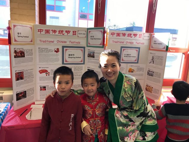 说起各班展台的准备工作, 学生、家长和老师的积极性空前高涨, 好几个班级领了一块展板还不够又加了一块, 结果办公室的冬梅女士不得不往返文具店两三趟才保证了展板需求。 马立平二年级展出的“中国节日”满满地贴了两大张展板, 身穿漂亮汉服的刘影老师为展览平添风采;马立平四年级展出的“折纸艺术”倾注了学生,家长,老师和志愿工姐姐的大量心血, 惟妙惟肖的双龙献福,飞鸟小猪以及手工折出的五彩小星星拼成的“折纸艺术”四个大字令一批又一批的观众大为赞叹。