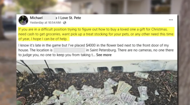 几天前,他在Facebook上发布了一条简短而真诚的帖子:“如果你需要帮助,请来我的前院。”随后,他将4000美元现金摆在自家前院,供任何感到困境的人自由取用。他说:“圣诞节对很多家庭来说充满压力,我只是想减轻一些负担。”