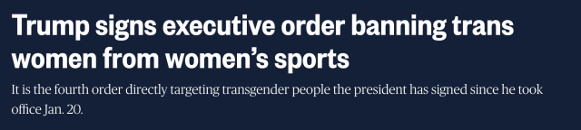 2025年2月5日,美国总统唐纳德·特朗普签署了一项名为“将男性排除在女性运动之外”(Keeping Men Out of Women's Sports)的行政命令,禁止跨性别女性(即出生时被指定为男性、但自我认同为女性的人)参加女性体育项目。