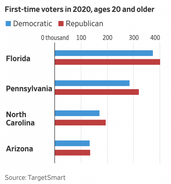美国各州最近刚刚公布了2020年大选的个人选民记录,数据发现在竞争最激烈的三个“摇摆州”(佛罗里达州、宾夕法尼亚州和北卡罗来纳州),共和党人选民比民主党人多了许多。