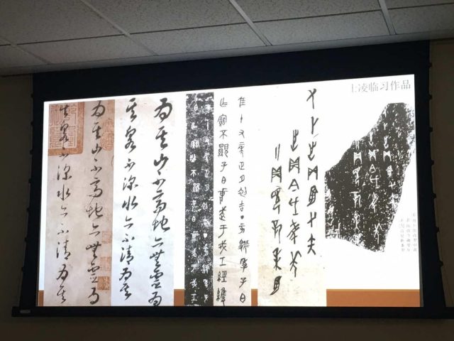 (二)为什么(Why): 临摹是学习书法的不二法门,是书法家的终身修行。他同时向听众展示了历代大书法家的学书的临摹作品,比如刘墉,吴昌硕,赵之谦,王铎,林散之等。
