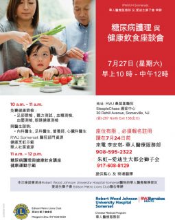 爱迪生大都会狮子会将与RWJ桑莫塞医院华人医疗服务部于七月二十七日(週六)上午十时至中午十二时,在该医院联合举办糖尿病护理与健康饮食座谈会,并提供免费健康筛检,也提供健康小食及现场翻译。