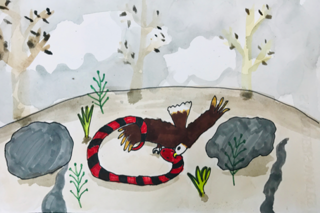 After a long time, the snake didn’t feel any movement so he peeked out and looked around. The eagle patiently waited on top of the rock for his chance, and he quickly sank his beak into the snake's neck, pulled the snake out of the crack, and held the snake down with his sharp talons. The snake struggled desperately, wrapping its strong tail around the eagle's wings, and at the same time turned its head to bite the eagle's leg. The eagle’s wings were held down by the snake, so he couldn’t fly. The eagle tried to stumble away, but his leg was bitten by the snake. In his weakened state the eagle was no match for the snake, which rose up to deal the killing blow.