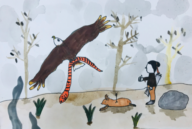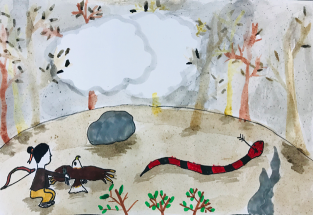 Suddenly, the hunter saw the eagle fold its wings and dive down towards the ground. The eagle's sharp eyes had seen a read and black striped snake slithering along the river bank. The eagle did not realize that as he hurtled towards the ground his shadow passed over the snake. The snake was startled by the sudden darkness and it quickly slithered beneath a large rock. The eagle tried to flip the rock over with his feet, but the rock wouldn’t budge. All the eagle could do was wait.