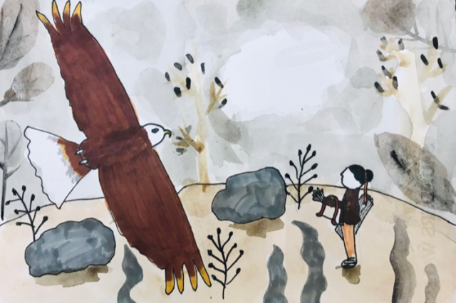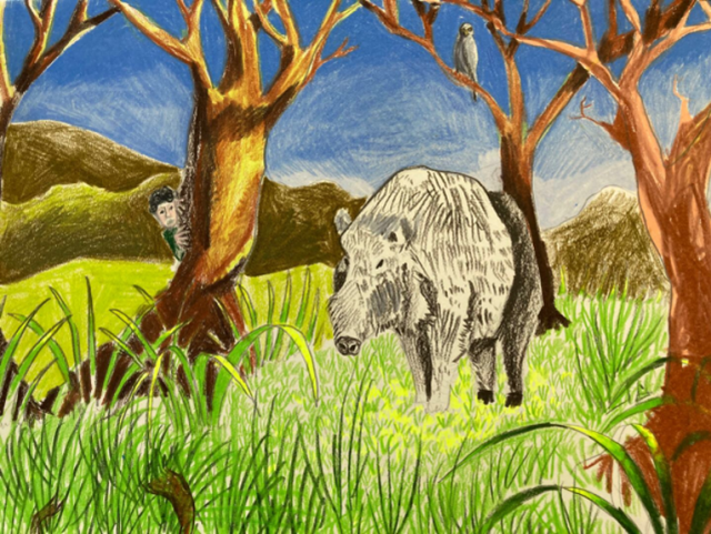 More than ten years had passed, the hunter was getting old and his hands and feet were not as flexible as they used to be. One day, the hunter was charged by a wild boar he had wounded with an arrow. The hunter was not quick enough to dodge and was knocked down by the wild boar. Just as the wild boar was about to bite the hunter, the eagle dived down and sunk its sharp claws into the wild boar's eyes. The blind wild boar ran around aimlessly and finally fell dead. When the eagle saw that the hunter's leg was stabbed by the wild boar's tusks and could not walk, he immediately flew back to the village and led the villagers to take the hunter home. During the hunter’s rehabilitation, the eagle hunted alone to ensure that the hunter had enough food.
