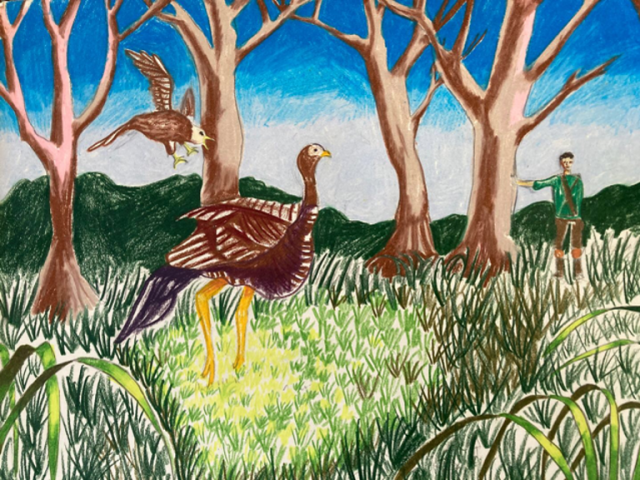 Sometimes the hunter would release the eagle to survey the area. When the eagle saw big prey such as a gray wolf, wild boar or deer, he would circle above it and indicate the direction for the hunter. The eagle was a great help to the hunter. The hunter was fully loaded after every hunt, and he rewarded the eagle with his favorite meat. The extra prey was shared with the poor villagers.
