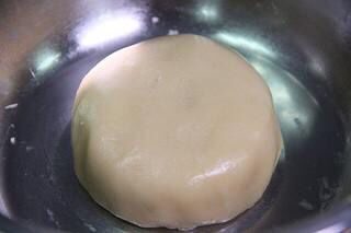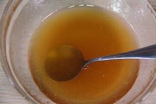 转化糖浆加入枧水、油,搅拌至乳化状。这个转化糖浆是做广式月饼皮的必备之物,用砂糖、水、柠檬酸制作而成,可放数日不凝固。