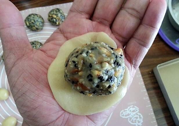 像包汤圆那样,将馅包入皮中,揉成圆团放到模子中,轻轻压出,一个个漂亮的月饼半成品展现在眼前,已是很有成就感的了。