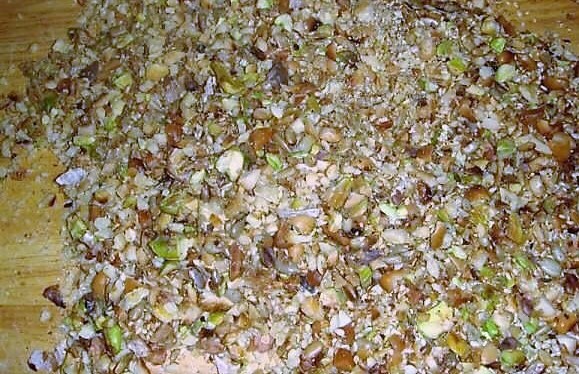 将备好的五仁稍加烘烤,加入炒熟的糯米粉、白砂糖,适量的玉米油,用水调和,同样放置一小时左右。